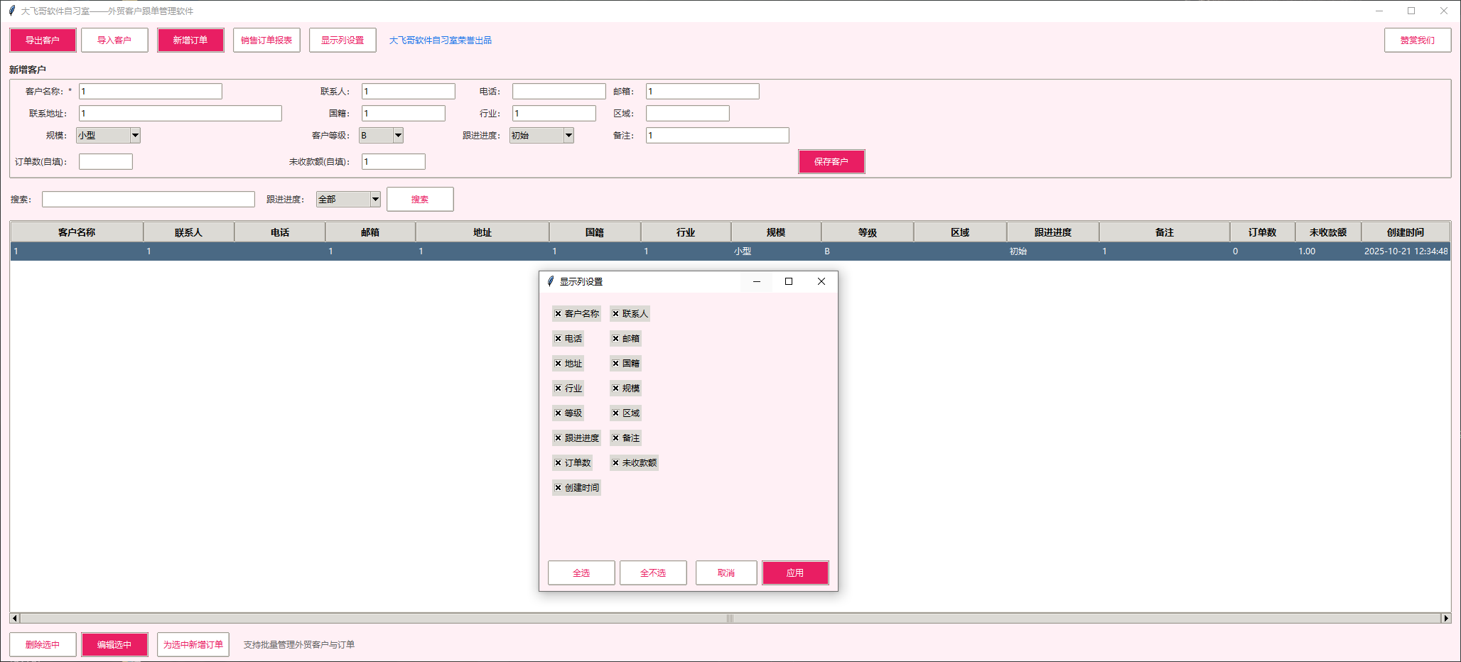 功能与特性围绕“高频刚需”展开:客户档案表格视图可自定义显示列,字段宽度与排序可直观调整;支持CSV批量导入与导出,便于与常用表格工具无缝协作;基础安全与本地化存储让业务数据可控可备份,适合需合规保护的客户资产;导航操作清晰,常用命令触手可及;在列表中可快速浏览、检索和定位目标客户,降低跨软件跳转的认知成本;同时保留扩展空间,便于后续叠加更多业务模块或团队流程。 软件设计不追求花哨与复杂,而是把核心环节做顺做稳,确保每天都能更快地完成客户开发、跟进、记录与复盘。对外贸团队而言,这款工具的价值在于“降低信息摩擦、提升成交效率”。它把分散在个人邮箱与表格中的信息汇总到统一视图,帮助你以进度为主线推进每一条线索;借助筛选与分级,让资源倾斜到最有价值的客户,减少无效沟通;通过简洁稳定的桌面体验,提升协作与交付的确定性。推广落地建议包括:将平台线索定期导入并统一分级;为展会或旺季准备批量导入模板;结合邮件与即时通讯工具建立跟进节奏;每周导出数据进行复盘与共享。当工具天然做对高频动作,你和团队就能把精力集中在商机本身,让开发更有序、跟进更持续、复购更可控,在竞争激烈的外贸环境里持续积累优势。